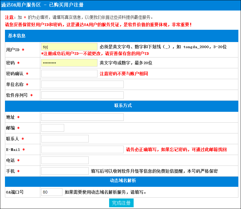 填写完毕后,点击最下面的"完成注册",会出现注册的信息,然后重新回到通达官方网站(http://www.tongda2000.com)网站首页,在用户服务区登录框上输入生成的用户ID和密码,点击“登录”进入用户服务区,这里可以享受到正式用户才能拥有的服务。