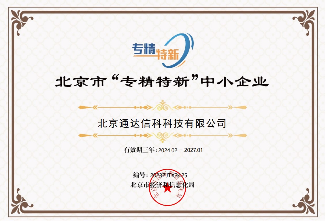 “专精特新”是国家为引导中小企业走专业化、精细化、特色化、新颖化发展之路,增强自主创新能力和核心竞争力,不断提高中小企业发展质量和水平而实施的一项重大工程。近年来,《“十四五”数字经济发展规划》、《国务院政府工作报告》中先后提出要加快培育“专精特新”企业,国家层面的支持力度也在持续加大。在以往数届的全国“专精特新”中小企业高峰论坛就曾多次指出,“专精特新”的灵魂是创新,强调“专精特新”就是要鼓励创新。此项荣誉的获得,是通达信科继通过国家高新技术企业、科技型中小企业、北京市创新型中小企业认定后,再获官方认可,是对通达信科创新能力、发展质量的重要肯定!