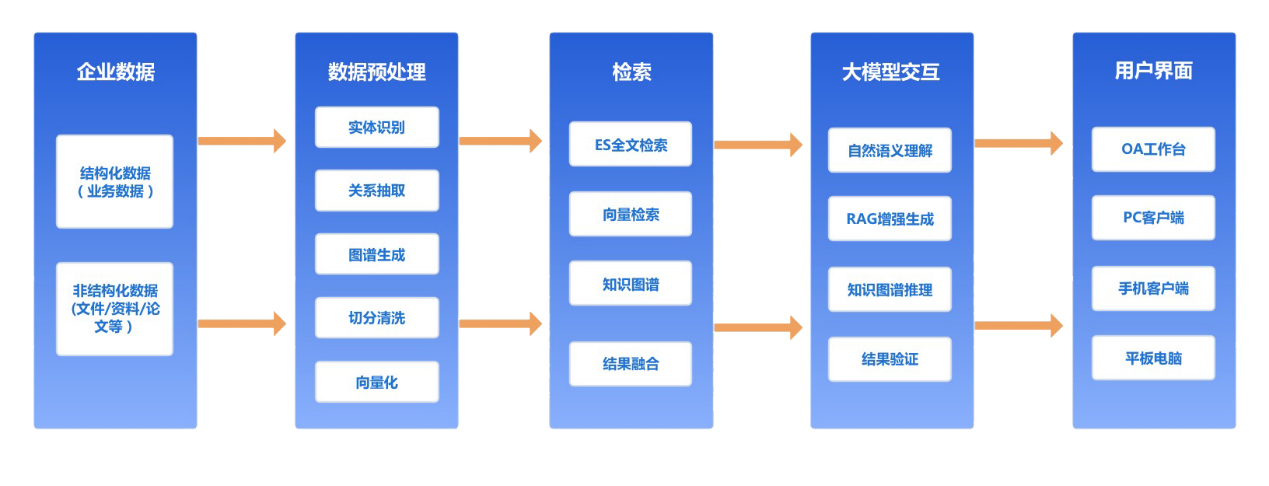 科研、生产制造等知识密集型企事业单位,往往都积累了大量的文字和数据资料,通达OA知识库、应用中心、流程中心都往往积累了大量的结构化、非结构化数据。接到这个需求后,通达OA团队立刻组织开展技术调研和论证,最终提出了基于私有化部署的DeepSeek开源大模型,结合OA系统中的大量文献资料、临床数据等结构化、非结构化数据,利用全文检索、知识图谱、RAG增强等技术,来实现DeepSeek大模型基于本地知识库的人工智能实践。