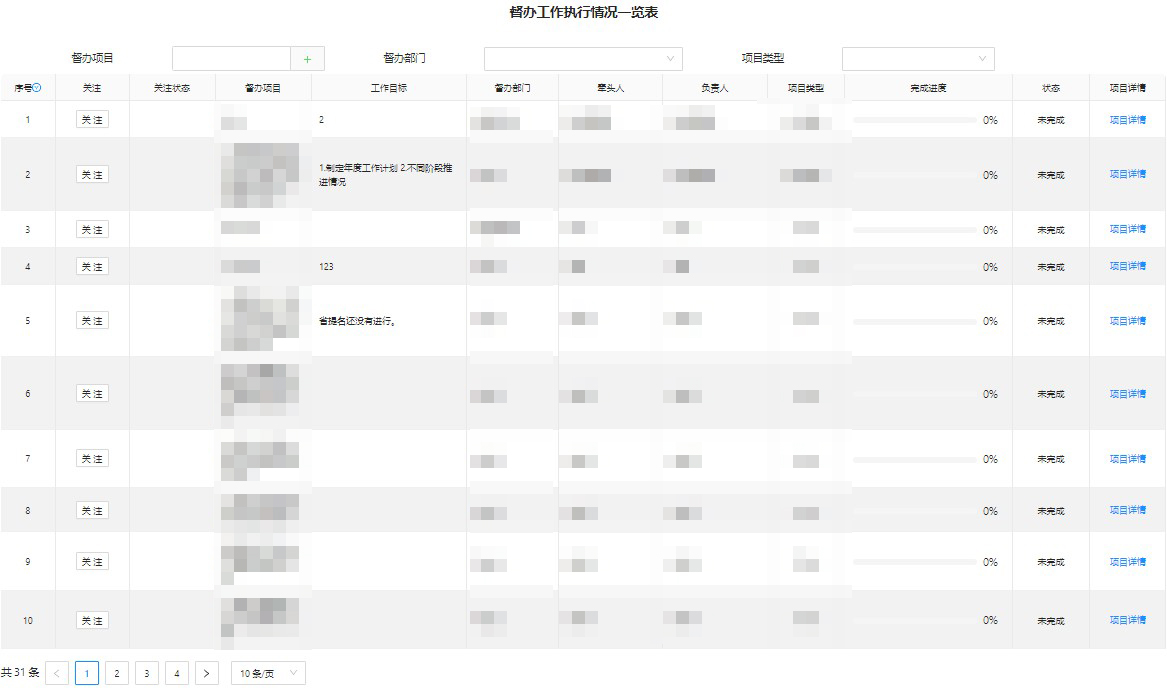 此页面可查看所有督办项目的执行情况。点击“关注”按钮即可关注项目,并自动向所有办理人发送领导关注提醒,确保项目得到及时跟进。