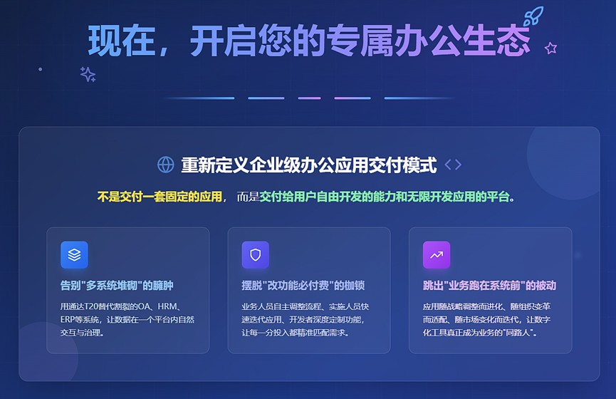 当中大型组织面临多系统林立、采购成本高、数据孤岛横亘、系统功能固化、开发周期长、成本高、新业务与新需求难以适配等困境时,通达T20智协同平台正以“平台+应用生态”的革新思维,凭借强大的平台能力向用户输出开发能力,将开发权交还到中大型组织自己手中,重新定义企业级办公应用的开发逻辑:不是交付一套固定的应用,而是赋予组织自由开发与构建无限应用的平台能力。