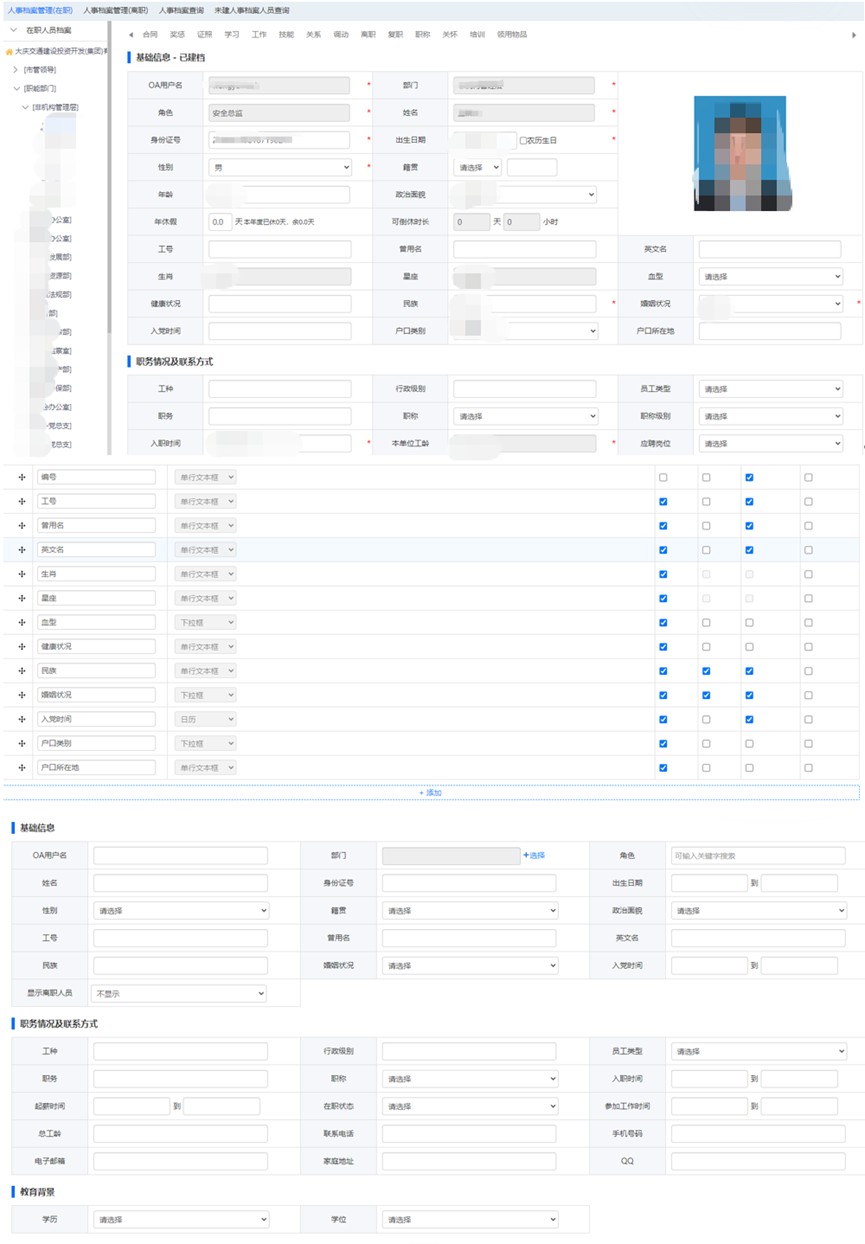 人事模块涵盖员工档案、合同、奖惩、证照、学习经历、工作经历、技能、社会关系、调动、离职复职、职称、员工关怀、培训及领用物品管理等。档案支持自定义字段(如单行文本、下拉菜单、日历等),并可直接基于这些字段进行模糊查询,提升管理精度与效率。
