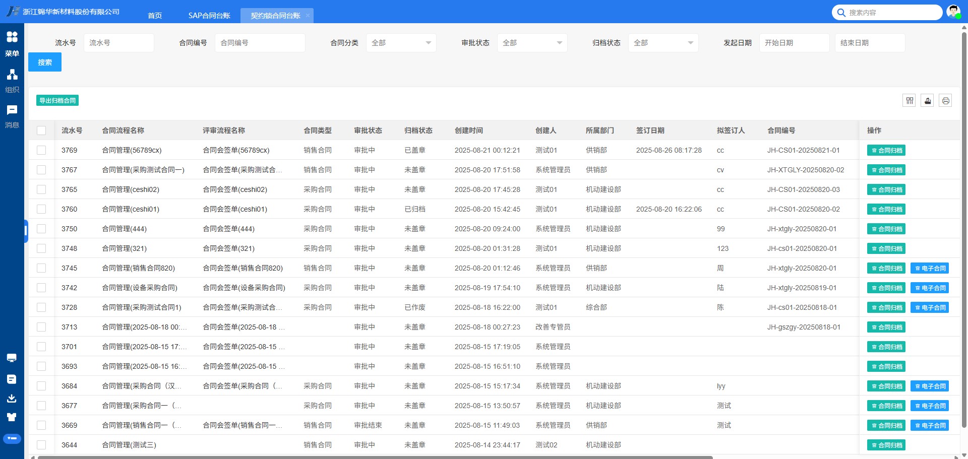 构建端到端的合同管理闭环。合同在OA系统内完成审批流程后,关键数据将自动同步至SAP生成销售或采购订单;同时驱动契约锁平台套用模板生成电子合同。所有业务数据最终汇集于统一台账,实现全流程数字化贯通与集中化查询归档。