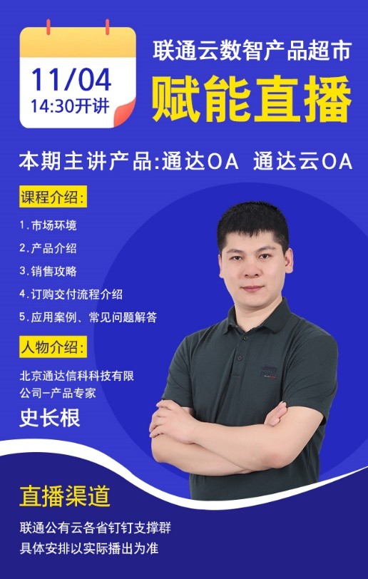 为持续深化合作,11月4日,一场面向全国联通体系的“通达OA及通达云OA产品”线上赋能培训会,在联通公有云官方直播间正式开讲。通达OA作为联通云的生态合作伙伴,其产品已在联通云平台稳定上架并运营多年。本次培训作为联通云数智产品超市生态赋能的重要环节,旨在为全国联通体系的业务骨干系统化提升产品认知与销售能力,从而为市场拓展注入新动能。
