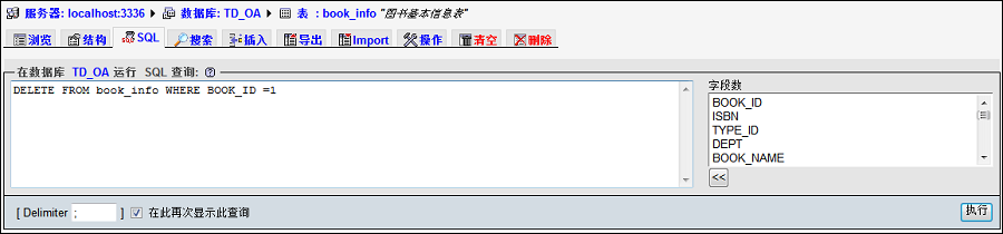 示例SQL语句:DELETE FROM book_info WHERE BOOK_ID =1