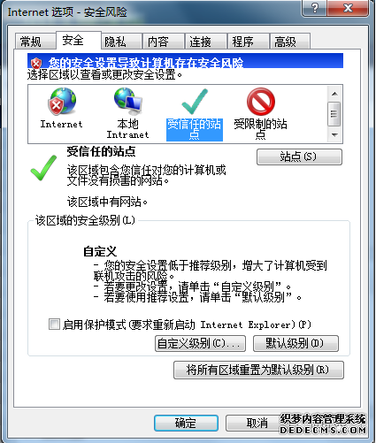 3、点击邮件添加收信人或者其他模块点击上传文件没有反应,请开启IE控件插件,取消阻止弹出窗口。打开菜单栏中的工具->Internet选项->安全->自定义级别。操作如图所示: